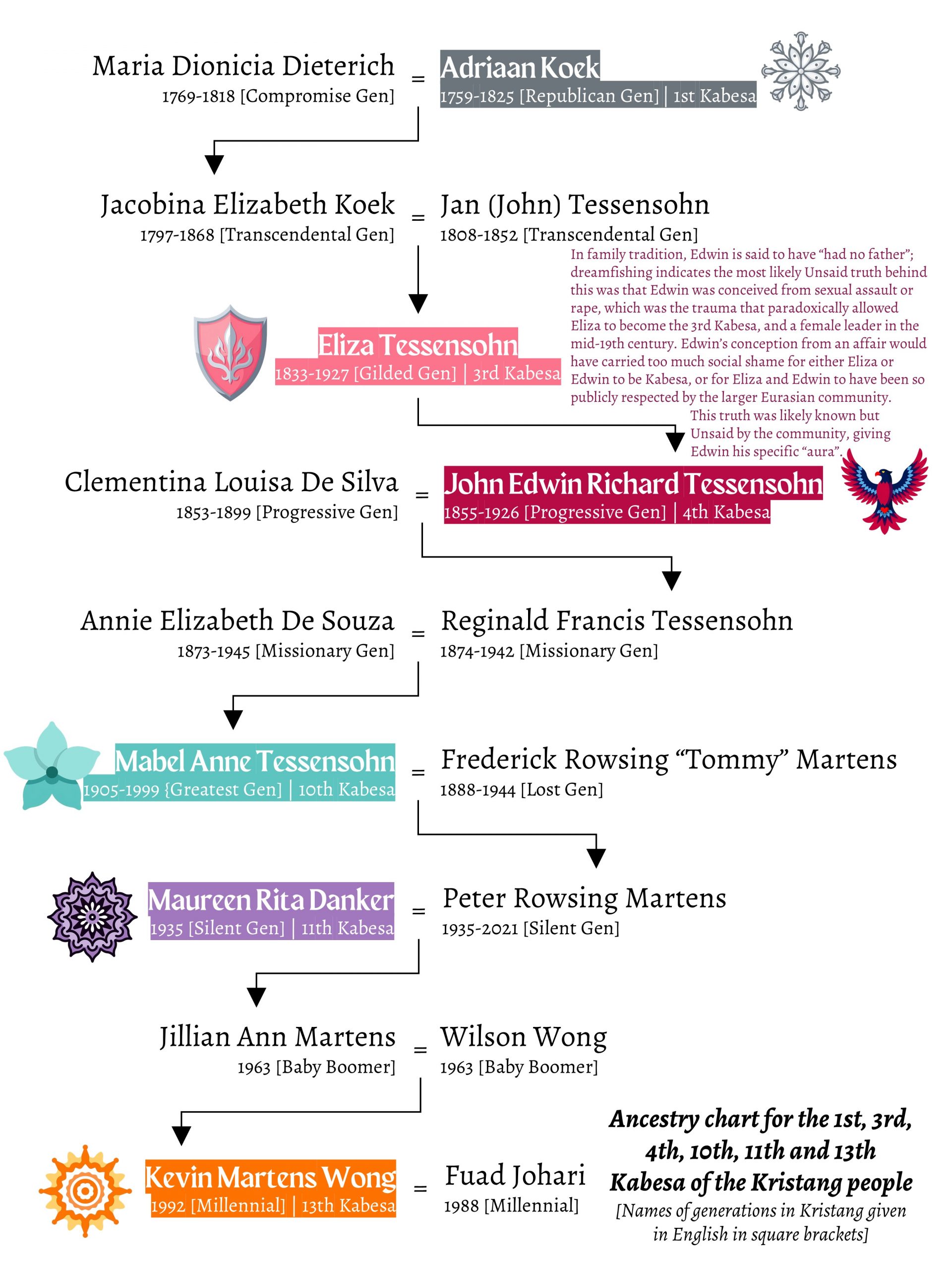 The 12 Kabesa preceding Kevin have Portuguese, Malay, Indian, Dutch, British, Sinhalese, Macanese, French, German, and multiple instantiations of unknown slave, concubine and orphan or adoptee ancestry and relation. A Chinese surname is therefore fully within historical norm, not an anomaly.
