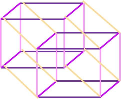 Individuation is thus consciously accelerating the integration of the temporally scattered parts of ourselves that, left in chronological time, would take a lifetime to integrate and cohere into one single self. An integration of tempu galifrei or time as kairos or kairotic time allows us to do this. Time cannot be accurately materially perceived by us as a spatial dimension beyond stylistic approximations of what it might look like, since we operate in three dimensions. However, an analogy of what 4D time would “look like” in 3D if those 3D senses were expanded beyond normal rational functioning would probably be something like this, with the pink, magenta and purple lines representing the axes of the 1st, 2nd and 3rd dimensions: